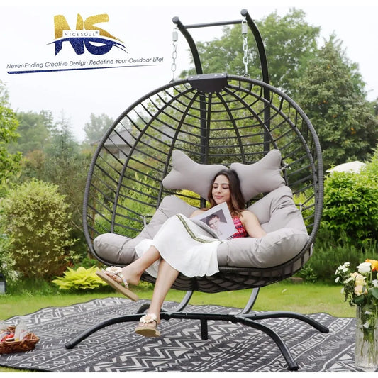 2 Person Double Egg Chair Outdoor Patio Wicker Loveseat Hanging Chair Swing Egg Chairs with Beige Cushions Double Seats