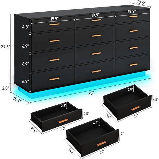 12-Drawer Dresser with Power Outlet and 60000-Color Lights 63-Inch Long Wooden Tall Storage Cabinet for Bedroom