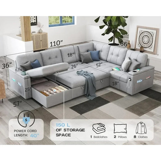 Oversized U-Shaped Sofa Bed – Sleeper Couch with 2 USB Ports, Cup Holders, Storage Chaise & 3-Seat Pull-Out Design
