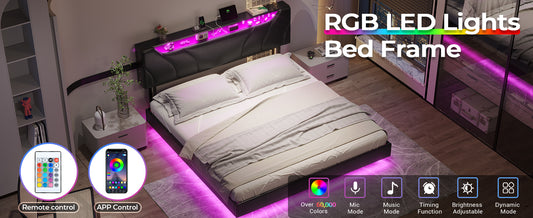Queen Size LED Bed Frame with Storage Headboard, Floating Design, Type-C Charging & Built-in Lights
