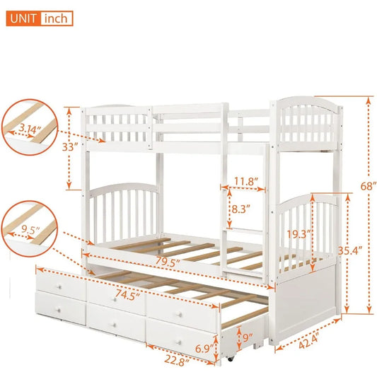Twin Over Twin Bunk Bed with Trundle, 3 Storage Drawers, Safety Rail & Removable Ladder – Can Be Separated into 3 Beds