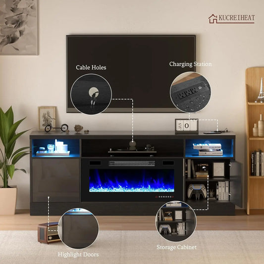 70" Electric Fireplace TV Stand, 80" TV Console, LED Flame & Lights