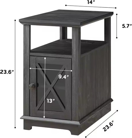 Black End Table with Charging Station | Narrow Nightstand with Adjustable Shelves