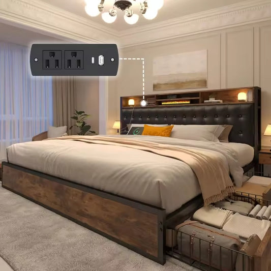 King Bed Frame with Storage Drawers & LED Lights, PU Leather Platform Bed with Headboard, USB & Type-C Charging Ports - King Size