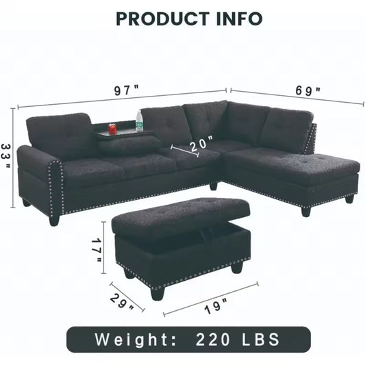 L-Shaped Sofa with Ottoman Linen Sectional Couch, Nail-Head Design & Cup Holder