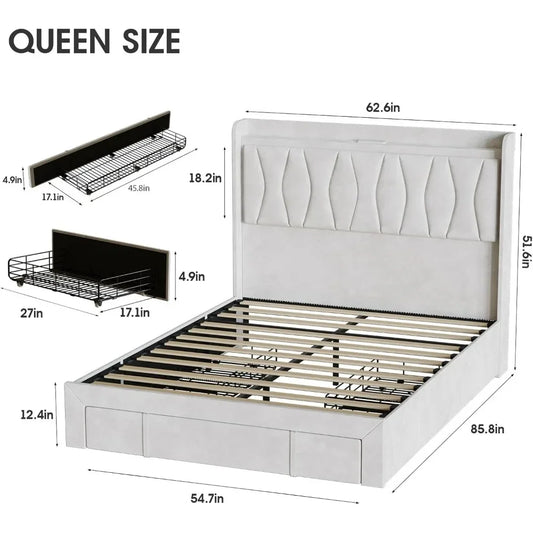 Bed Frame with LED Light and 3 Drawers Storage Charging Station Wingback Tall Headboard Upholstered Velvet Platform Bed