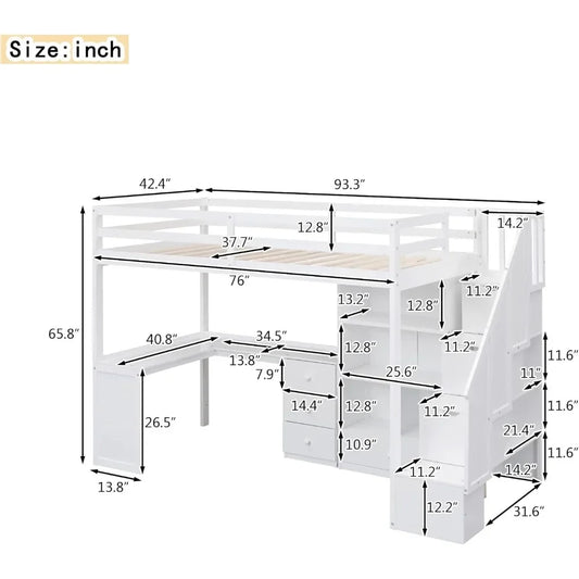 Twin Size Loft Bed with Stairs & L-Shaped Desk – Wood Loft Bed with Storage Drawers & Shelves, Stairway Frame