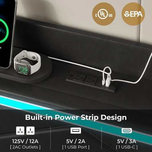 Full Size Upholstered LED Platform Bed with 4 Storage Drawers, Charging Station & LED Lights