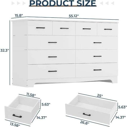 White Dresser for Bedroom with 10 Drawers Large Chest of Drawers Storage Organizer TV Stand with Power Outlets